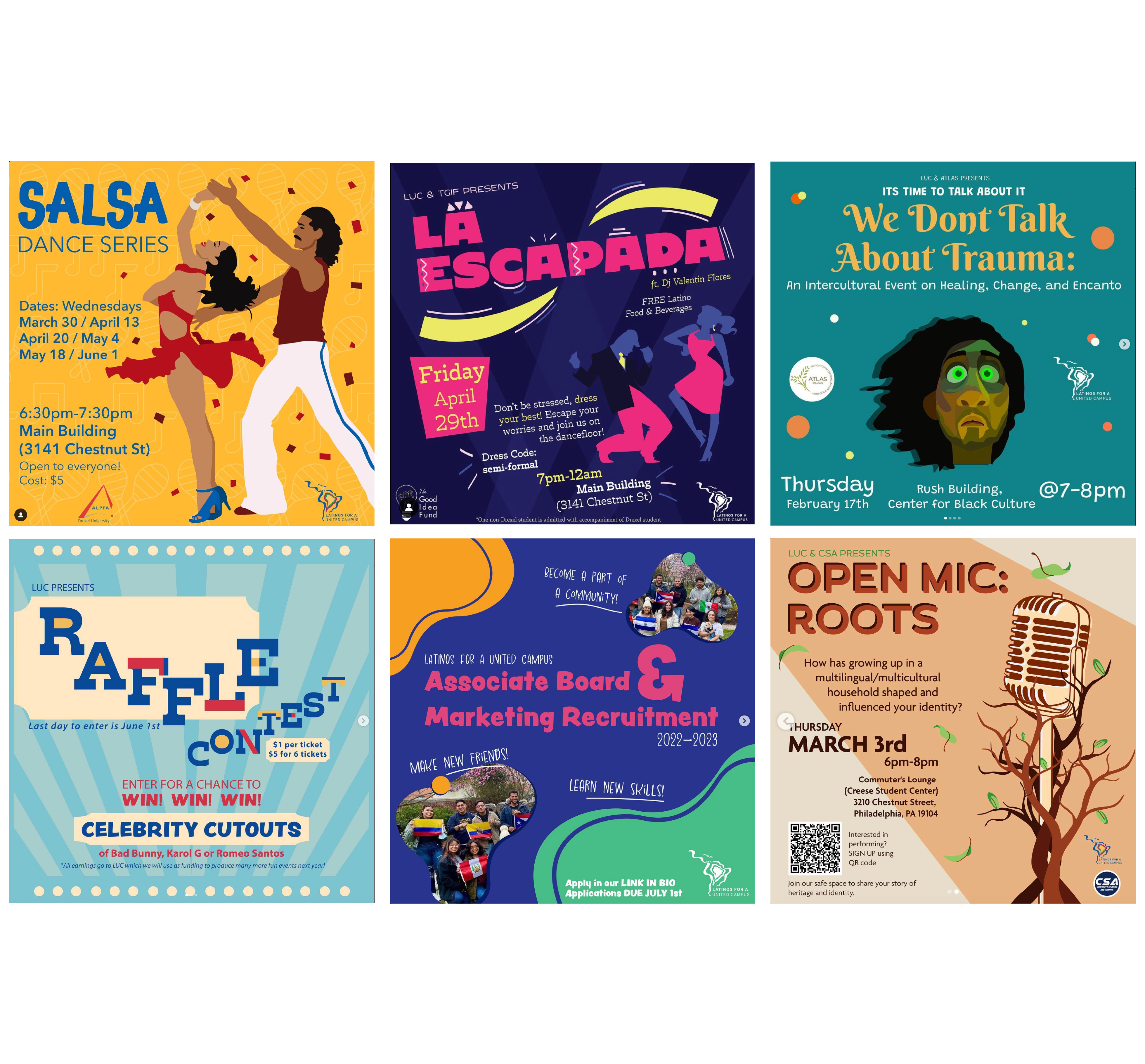 Latinos for a United Campus is Latine organization at Drexel University. Their goal is to create Latine cultural awareness and to united the Latine community through social and cultural events. As their previous graphic designer, social media manager, and marketing director, I was determined to grow and unite our community on campus. In 2021 I was commissioned to design their new logo. The logo represents the lively, vibrant community with a strong color palette and mimics organic movements from traditional clothing patterns and dances.