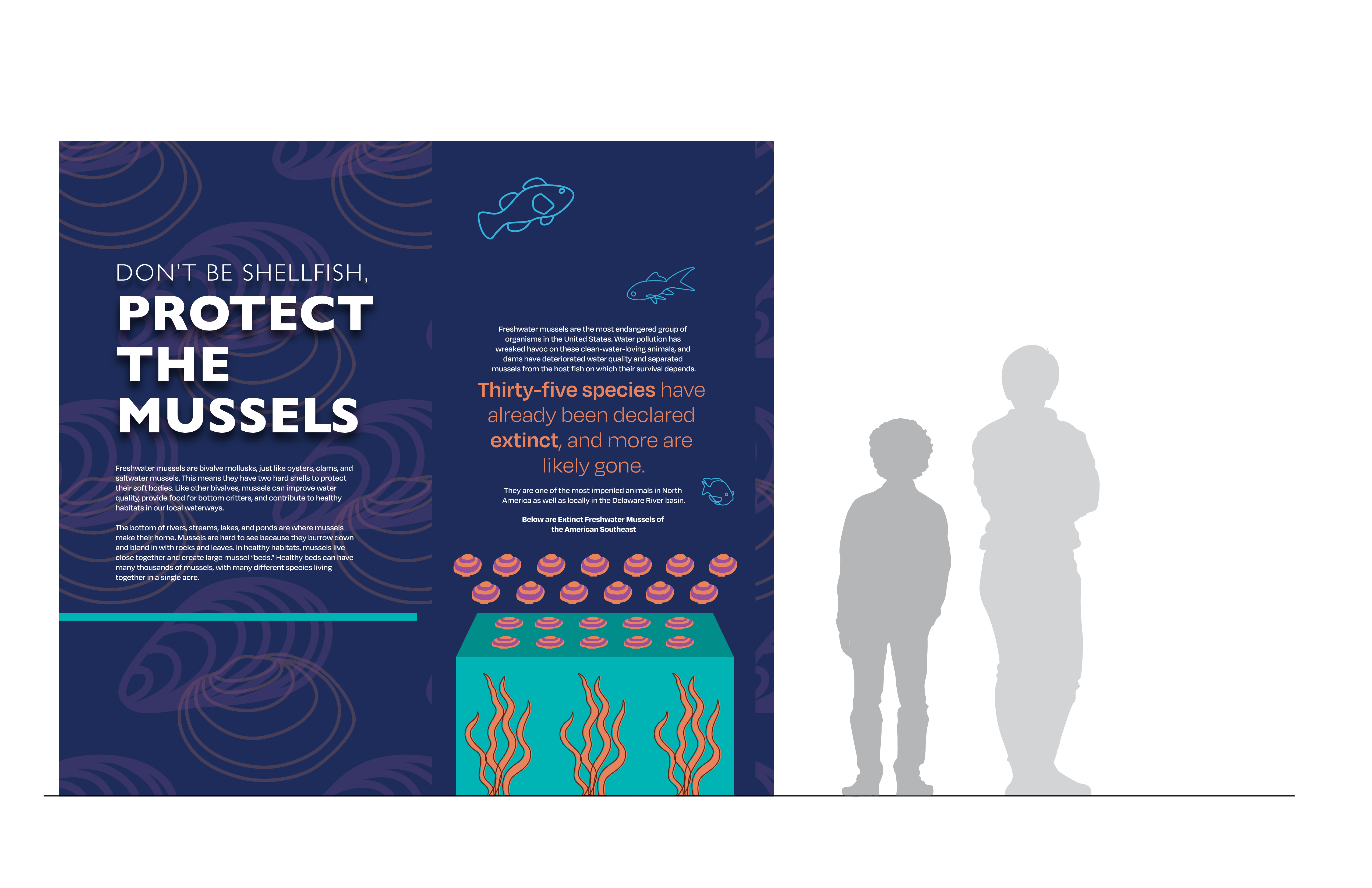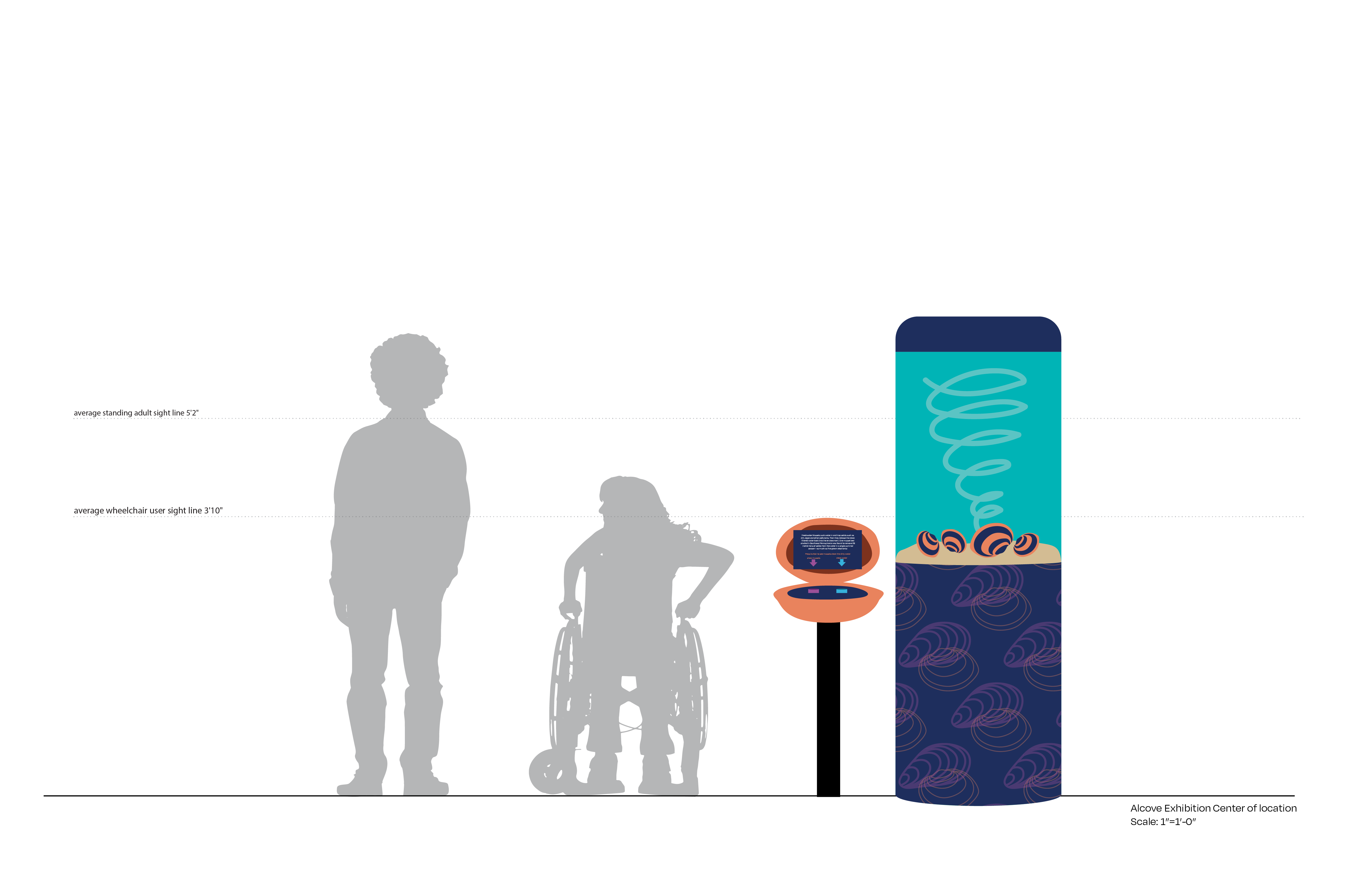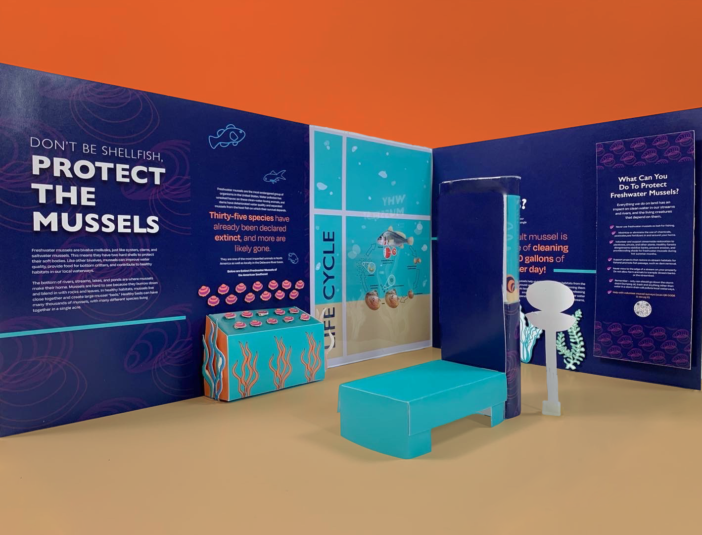 Did you know that freshwater mussels are the most endangered aquatic animals in North America? If not, swim around the mussels exhibition with me! This project focuses on how we can save the endangered species and educate visitors on how mussels protect our freshwater systems. To form a connection with the mussels, the exhibition is inspired from the bottom of a stream where most mussels tend to live. This system immerses the visitor into the home of a mussels and includes interactive elements of a filtering system and interactive shells.