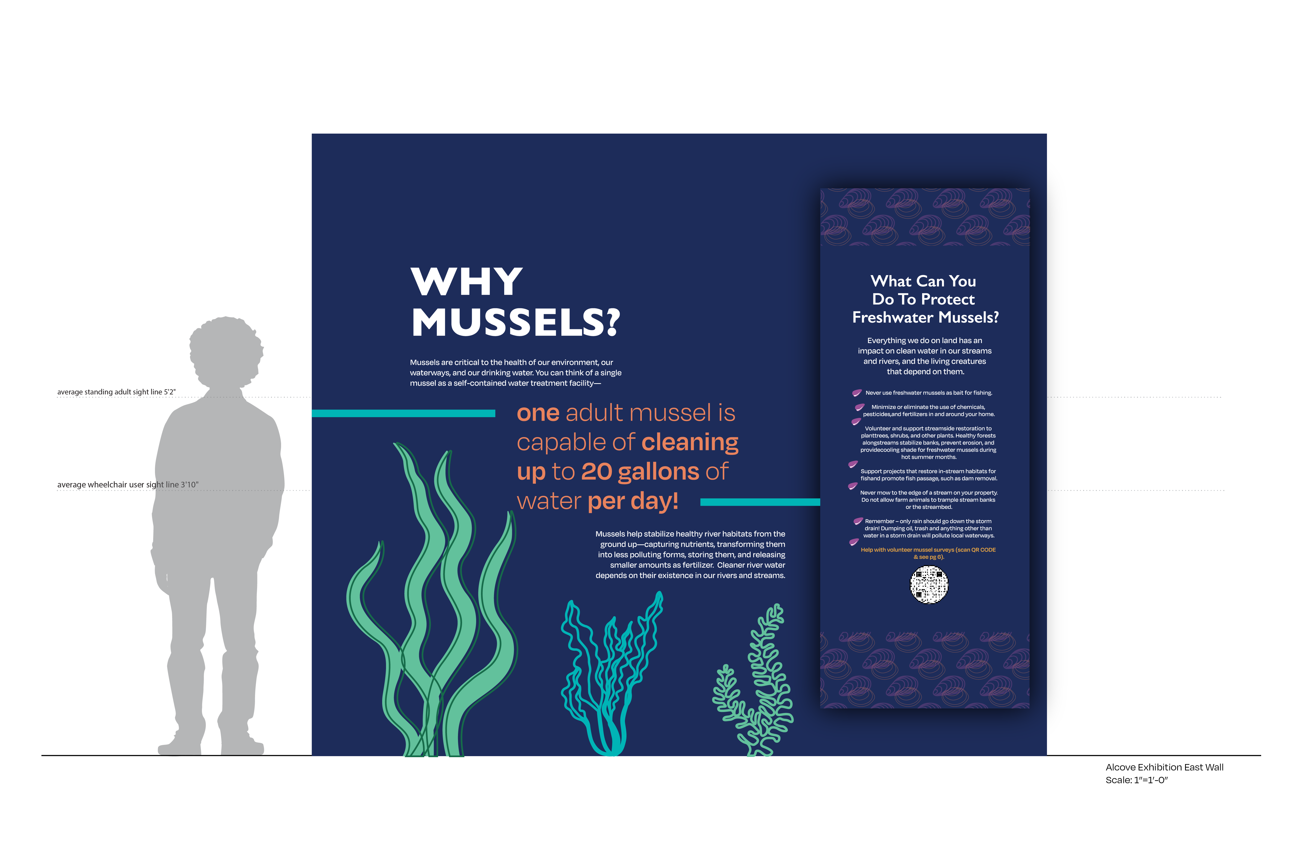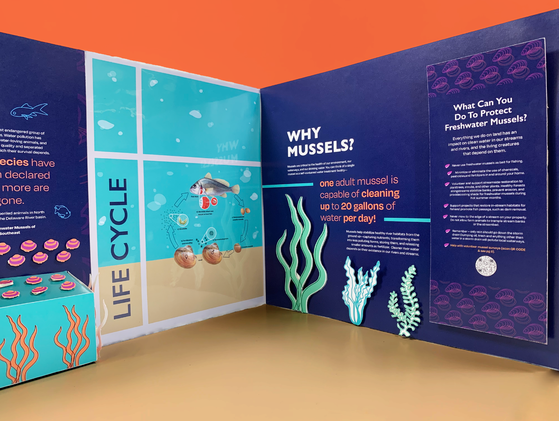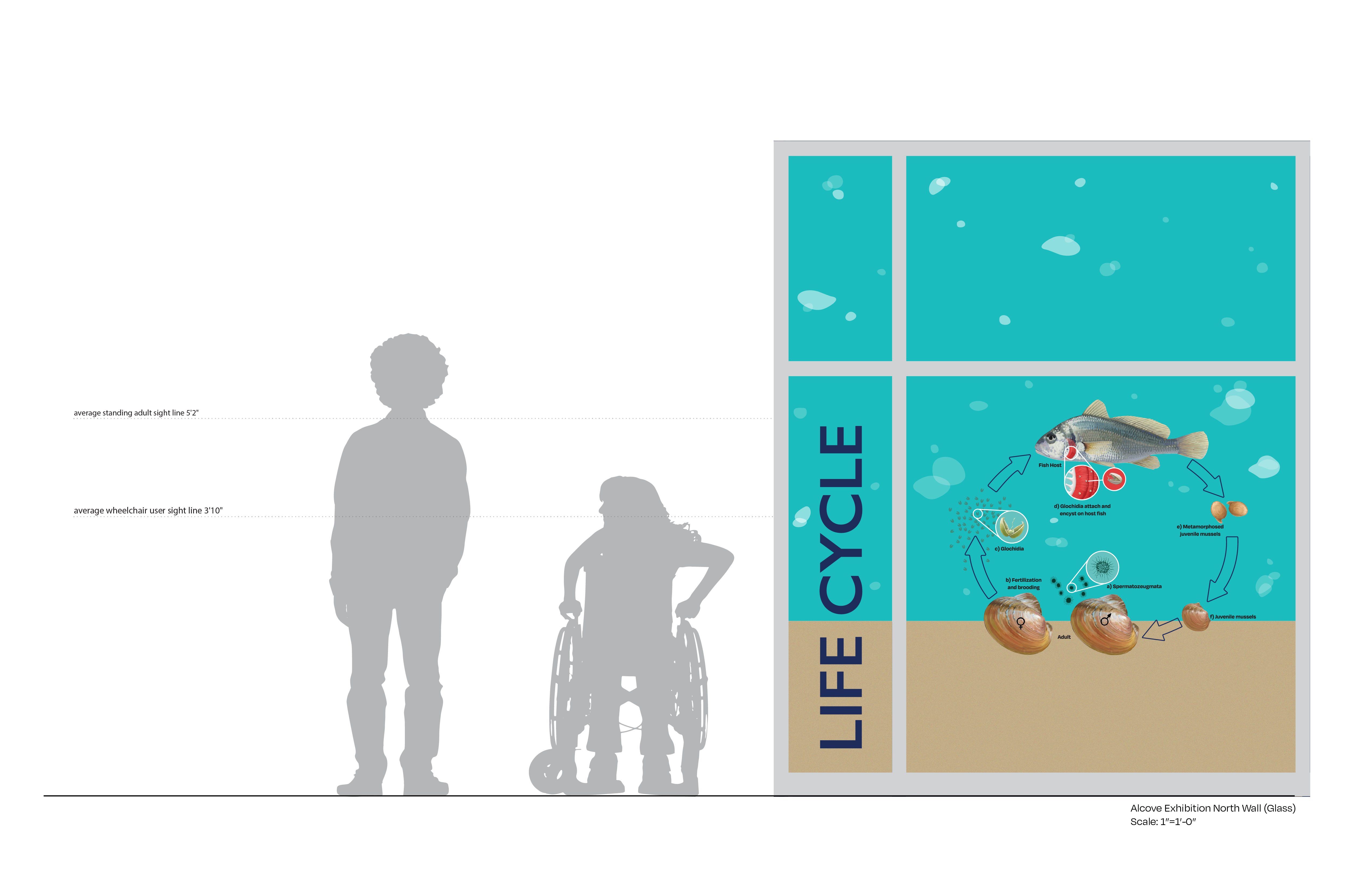 Did you know that freshwater mussels are the most endangered aquatic animals in North America? If not, swim around the mussels exhibition with me! This project focuses on how we can save the endangered species and educate visitors on how mussels protect our freshwater systems. To form a connection with the mussels, the exhibition is inspired from the bottom of a stream where most mussels tend to live. This system immerses the visitor into the home of a mussels and includes interactive elements of a filtering system and interactive shells.